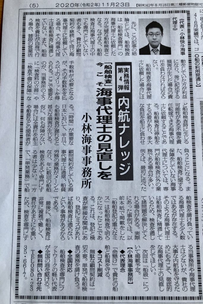 大変お世話になっている【内航海運新聞】で小林海事事務所の連載記事『内航ナレッジ』第四弾と広告も同時に掲載されました!