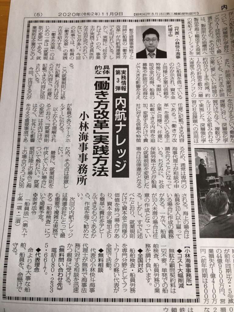 11月9日の「内航海運新聞」で小林海事事務所の記事が掲載されました!