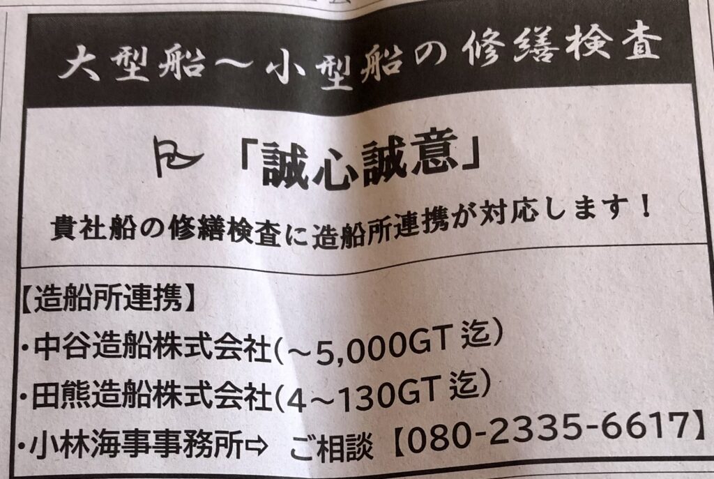 現在では、貨物船などの大型船舶は中谷造船株式会社様、旅客船などの船舶は田熊造船株式会社様と造船所連携もバランスよく業務出来る体制となりました。