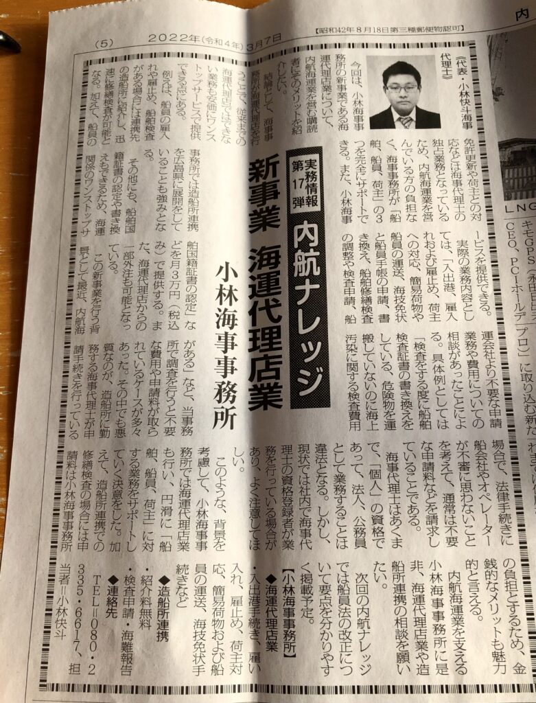 今回も当事務所の記事をご覧いただきありがとうございます! 3月7日付けで内航新聞社の内航海運新聞にて「内航ナレッジ」シリーズを掲載させていただきました。 海運代理店業について 本誌では小林海事事務所として海運代理店業の業務も行う内容となってい... -