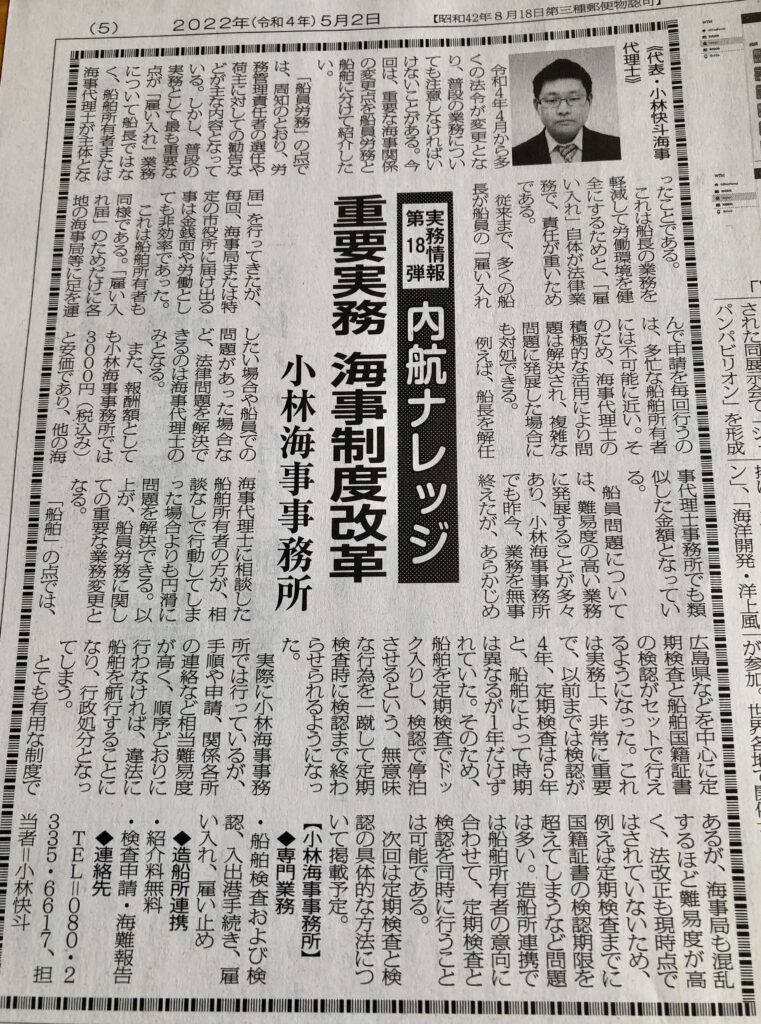 小林海事事務所の記事をご覧いただきありがとうございます。 今回は5月2日と9日の合併号である内航海運新聞掲載の記事を簡潔に紹介します。 主な内容 海事関係の大きな改正や船舶検査時の改革を実務の視点から掲載しました! 船員労務部分 船員労務では労... -